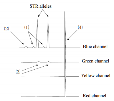 【已刪除】二、下圖為以毛細管電泳進行 STR 標記型別分析之電子訊號圖,請說明圖中⑴至⑷所標示 箭頭處之訊號名稱、訊號產生原因及其改善策略。(20 分)