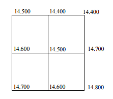 【已刪除】五、有格網水準各節點數據如下圖所示,單位為 m,各格網間長寬均為 5 m,格網設計 高程均為 14.600 m,求其各格網挖或填之土方量,與其總挖填土方量。(20 分)