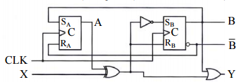 5 使用 2 個SR正反器(flip-flop)與 3 個邏輯閘組成一時序電路(sequential circuit)如下圖所示,其中 SR正反器由NAND閘所組成,A、B表示狀態位元,X表示外部輸入位元,Y表示輸出位元,SA與RA表 示第一個SR正反器之輸入位元,SB與RB代表第二個SR正反器之輸入位元,CLK表示時脈。關於各個 B B 邏輯閘與正反器之時間參數(tpd表示傳遞延遲時間,ts表示就緒時間(set-up time),th表示保持時間(hold time))如下: