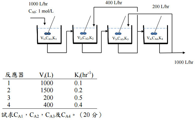 【已刪除】五、化學反應在一系列四個連續式攪拌反應槽(Continuous Stirred Tank Reactor, CSTR) 中發生,流程如下圖所示,反應方程式為