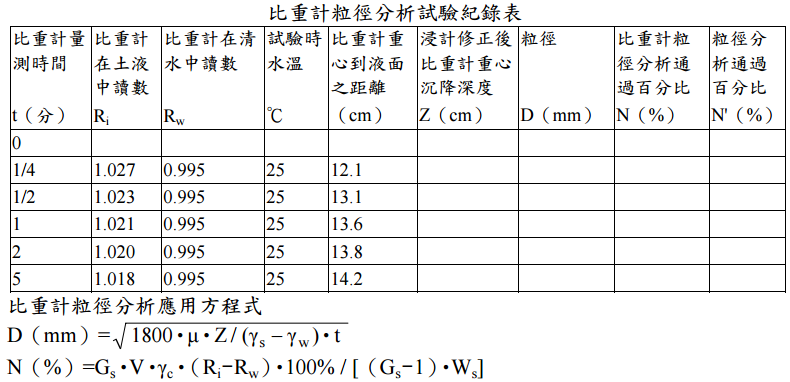 =0.9982, 比重計放入量筒中量筒水面上升 2 cm, 試驗時量筒土液體積為 1000 c.c.。