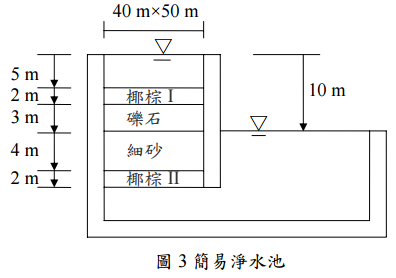【已刪除】四、某斷面積 40 m×50 m 之簡易淨水池如圖 3 所示,共配置四層濾層,其垂直透水係數 如下: 椰棕I,k