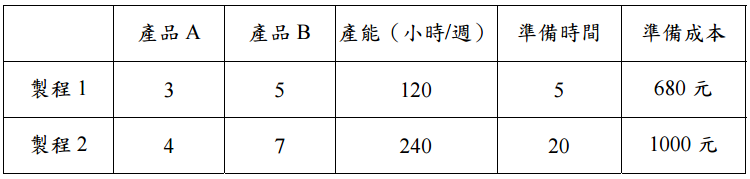 【已刪除】三、某工廠可選兩種製程之一來生產兩種產品 A 與 B,下表為各製程生產一單位產品所 需時間及每週產能: