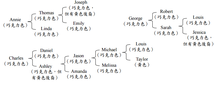 【已刪除】四、拉不拉多犬的毛色受到兩個基因座上基因的影響,也就是 B(黑色)基因座與 E(色 素)基因座:黃色基因型為--ee、黑色基因型為 B-E-、巧克力色基因型為 bbE-。有 Annie、George、Charles 三隻巧克力色的拉不拉多犬,其系譜資料如下;如果你只 想要巧克力色的犬,則母犬 Annie 應該與 George 或 Charles 配種較為適宜,其生產 巧克力色犬的機率為何?(10 分)