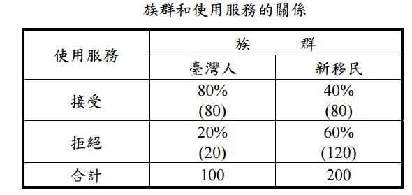 【已刪除】四、根據下表,解釋臺灣人或新移民使用服務的關係。並解釋你/妳為什麼希望以推論統 計,深入分析資料。(25 分)