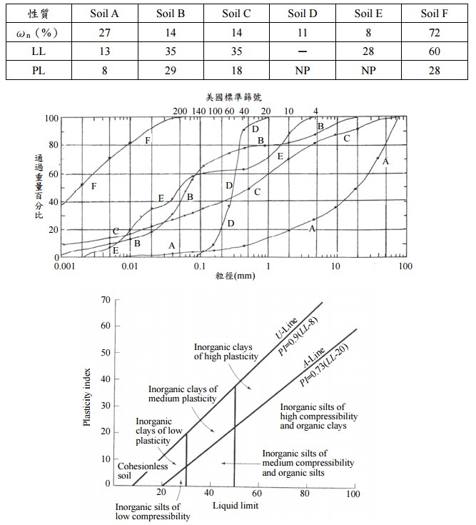 【已刪除】一、根據下列顆粒分布曲線及塑性圖,利用 USCS 分類系統,將土壤 A 至 F 分類。(15 分)