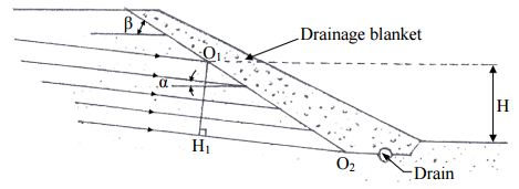 。土層中之 滲流水呈直線均勻的方式流動,且水流在接近坡面之排水鋪層(drainage blanket,滲透性係數k