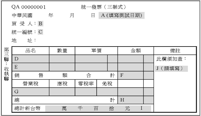【已刪除】5.王先生為葉業國際有限公司購買二盒禮品每盒1,830元、文具用品一套2,500元贈送客戶須報帳(稅已內含),請開立統一 編號33445566,請您試開立三聯式發票,依下列方框內標示題號(A至J)依序作答,填寫於答案卷並註明題號。