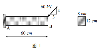 【已刪除】一、一等向均質彈性材料 AB 長 60cm,斷面尺寸為 8cm × 12cm 之矩形,固定於支承面 A。在端點 B 斷面剪力中心軸上端施加一 60kN 之傾斜力(傾斜角度為 3:4,如圖 1 所示)。試求⑴支承端斷面 A 之軸向應力分佈(15 分);⑵該斷面中性軸(N.A.) 之位置。(5 分)⑶又若此材料之張力及壓力降伏強度皆為 280MPa,試求其安全 因數。(5 分)