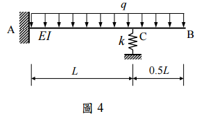 【已刪除】四、一長度為 1.5L 之均勻懸臂梁(EI =常數)承受一側向均佈載重 q,在距離固定端 L 處有一彈性支承如圖 4 所示。若該彈性支承為線性,彈性常數為 k =3EI/L