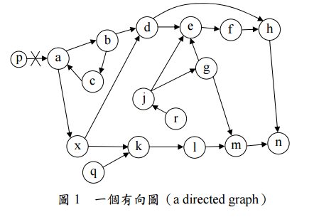 【已刪除】 ⑶假設圖 1 代表 heap 上各個節點(node)及其相互指向的關係。p、q、r 三節點代 表全域變數(global variables),其他的節點代表 heap 上的記憶體區塊。如果 p→a 的指標被消除,那些節點會變成無用的垃圾節點?你必須詳細描述尋找垃圾 節點的方法及所需之資料結構。你的演算法只能從 a 節點出發,它必須指出所有 的垃圾節點,並且你的演算法只能在每一個節點儲存很少量的資料。請問你的演 算法必須在每一個節點儲存那些資料?(15 分)
