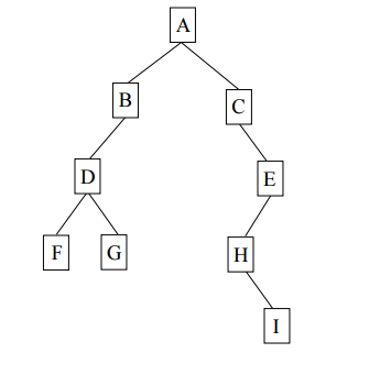 如果 LEFT 欄位代表一般的節點指標,則 LTAG = 0。如果 LEFT 欄位代表引線指標, 則 LTAG = 1。同理,如果 RIGHT 欄位代表一般的節點指標,則 RTAG = 0。如果 RIGHT 欄位代表引線指標,則 RTAG = 1。 請將下圖的二元樹加上適當的引線指標,讓它變成引線樹,並請繪圖標出 A 到 I 共 9 個節點中所有引線指標指向的節點。(10 分)