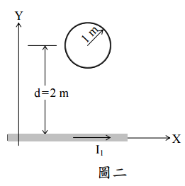 【已刪除】三、如圖二所示,載有 25 安培之無限長直線電流導線與 X 軸一致,電流之方向亦為 X 軸的正方向,而距導線 2 m 處之 XY 平面則有一個 20 匝(turn)的環形線圈,若環 形線圈中心處的磁場為零,則此環形線圈上所通過電流的大小及方向應該為何? (20 分)