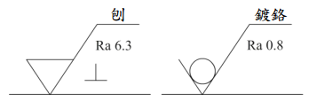 【已刪除】三、在工程圖上看到兩個表面織構符號(surface texture,又稱表面符號)標註如下,請 說明這兩個符號要求在加工製程上的差異。(15 分)