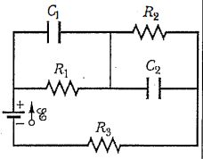 9. In the right figure, \( R_1 = 5\Omega \), \( R_2 = 10\Omega \), \( R_3 = 15\Omega \), \( C_1 = 5\mu F \), \( C_2 = 10\mu F \), and the ideal battery has an emf \( \varepsilon = 20V \). In steady state, the total energy stored in the two capacitors is: