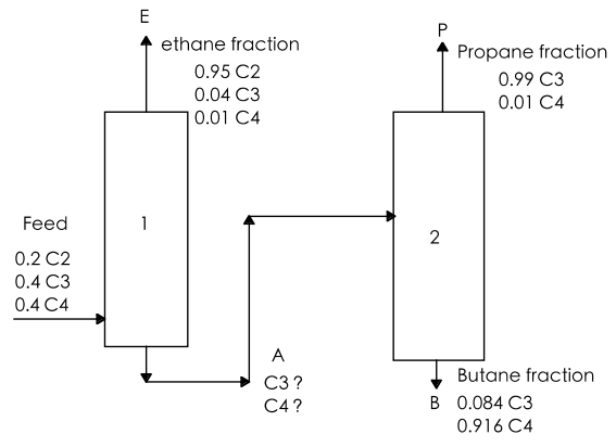 【已刪除】四、如下圖蒸餾塔,第一支蒸餾塔液體進料,含有 20 mole%乙烷,40 mole%丙烷, 40 mole%丁烷,蒸餾的各成分如圖所示。當進料為 100 mole/hr,請計算 P 的莫耳流 率(mole/hr)和 A 的組成。(20 分)