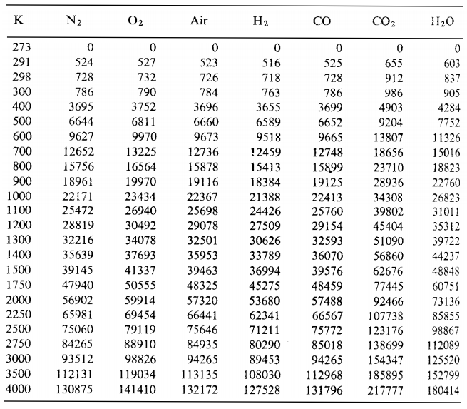 計算請參用下列所附的溫度(K)vs.焓(Enthalpy)資料表(單位:J/mole)。