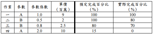 【已刪除】五、某一工程專案包含四項主要作業,其利用參數價法(parametric cost estimate)估算 工程預算。該專案選擇基地面積(A)與總樓地版面積(B)為參數;該工程基地面積(A)值 為 2,總樓地版面積(B)值為10(註:參數係數係指作業數量與參數之倍數關係)。截 至目前為止,各作業之預定完成進度與實際完成進度(以百分比表示)如下表。且依 據工地實際紀錄,該工程截至目前為止,實際工程成本為45 百萬。請依據實獲值管 理(earned value management, EVM)之概念,計算該工程專案之 BCWS、BCWP、 CPI 及 SPI,並說明該工程專案的成本與進度執行績效。(註:計算 CPI 與 SPI 時, 以 BCWP 為分子方式表示與計算)(20 分)
