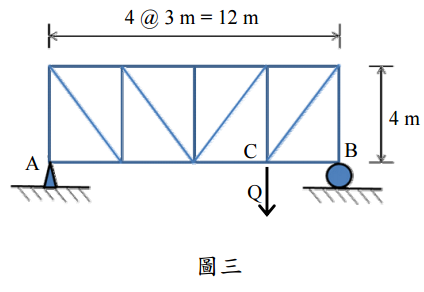 【已刪除】三、某廢棄工廠再利用案例中,有一個鋼鐵桁架結構狀況良好,各桿件的斷面尺寸皆相 同,如圖三所示。由於需要在 C 點加上載重 Q,故先要評估其結構安全性。今擬 就 C 點有載重時,可能造成那根桿件最先發生挫曲破壞進行評估(可忽略自重影響), 試提出評估結果。(20 分)