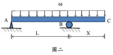 【已刪除】二、圖二為簡支梁,其右端帶有懸臂長度,梁上承受均佈載重。若 X = L/2,則 AB 間的 最大彎矩為何(10 分)?若此梁為 RC 構造,試繪出因彎矩產生的主要拉力鋼筋位 置(10 分)。