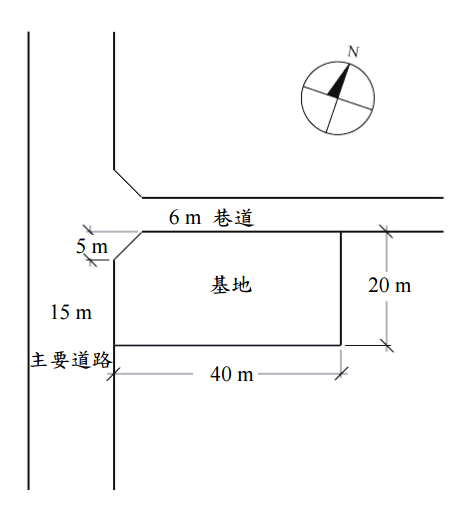 基地位於某鄉鎮市區,基地兩面臨路,主要道路面寬 15 m,次要道路面寬 6 m,