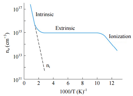 )和溫度倒數(1000/T)的關係如圖所示。今有某 n 型半導體材料,其摻雜元素能階在導帶下方 0.05 eV,若將摻雜元素更換為能階在 導帶下方 0.1 eV 的元素,請問⑴高溫本質區(Intrinsic)的濃度是否改變?⑵雜質區 (Extrinsic)轉換為游離區(Ionization)的溫度是否改變?請說明理由。(20 分)