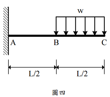 【已刪除】四、一懸臂梁受分佈力作用於右半段如圖四所示,此梁有固定之撓曲剛性(Flexural rigidity)EI 值。以積分法推導梁的撓度方程式(Deflection by integration)。(設材 料為線性彈性材料)(20 分)
