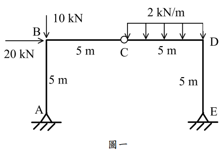 【已刪除】一、如圖一所示之結構,試求出 A 點及 E 點之反力。(25 分)