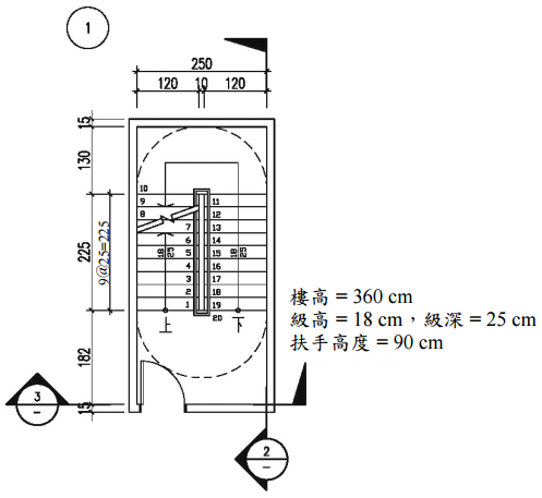 【已刪除】四、在三樓標準樓層之平面圖上,繪製一座 U 形摺梯通往四樓,如下圖所示,設定樓層 高度為 360 cm,級高為 18 cm,級深為 25 cm,扶手高度為 90 cm,請依剖面線分別 繪製剖面圖(10 分)和立面圖(10 分)。