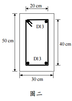 = 1.5 tf-m,閉合箍筋採用 D10,如圖二所示,試求箍筋 間距,並檢核斷面之鋼筋配置是否恰當。(已知 fc ′=280 kgf/cm