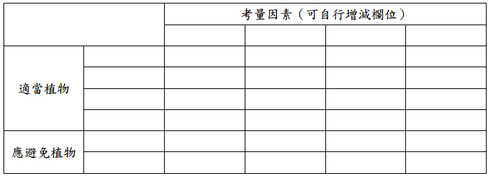 【已刪除】二、請製表說明你在為一個小學作植栽計畫時,會考量那些因素?請列舉適當植物四種、 應避免植物兩種,並標示這些植物符合(O)或違反(X)那些考量因素。下表為 示意,欄位請自行增減。(25 分) 考量因素(可自行增減欄位) 適當植物 應避免植物