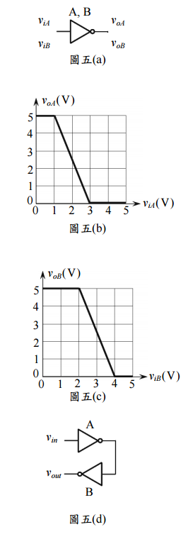 )特 性分別如圖五(b)與圖五(c)所示,畫出圖五(d)串接反相器之輸入輸出(v