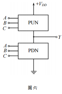 【已刪除】六、圖六之 CMOS 邏輯閘含上拉網路(pull-up network, PUN)與下拉網路(pull-down network, PDN),設計 PUN 與 PDN 實現 Y =
