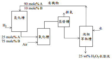 在液相萃取槽加水提取,生成 25 wt%的雙氧水溶液,有機物 (90 mole%A+10 mole%B,不含水)再循環回氫化槽。假設有機物(A 和B)在蒸 發槽和萃取槽沒有損失。如果每天要生產 1000 kg的雙氧水溶液,⑴計算氫、空氣 和水的每日進料量(kg/天);⑵計算有機物(A和B)總莫爾數在製程內所需的循 環量。(20 分) 氫化反應 A+H