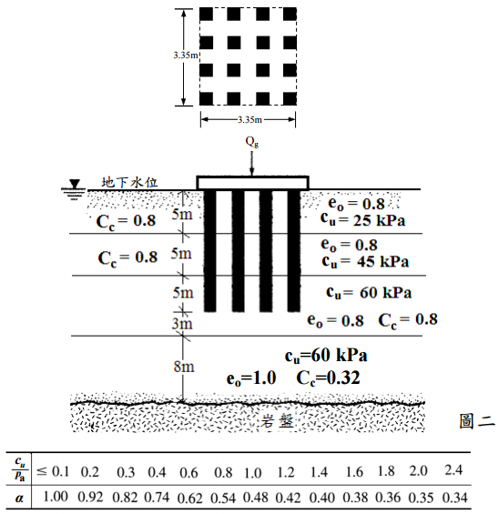 ,新增之平均垂直應力是以 2 : 1(V:H)分佈方式向下傳遞,試計算此群樁 之壓密沉陷量為若干 mm?(圖二中之 cu 為黏土層之不排水強度,eo 為黏土層之孔隙 比,Cc 為黏土層之壓縮性指數)(註:單一土層以單層計算即可)。(每小題 12.5 分, 共 25 分)
