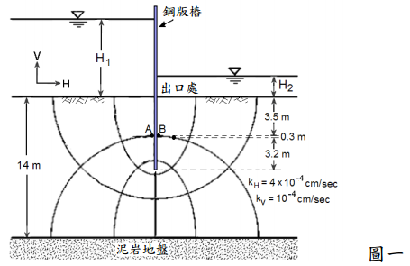 【已刪除】⑶試 求出口處之水力坡降及其抗砂湧之安全係數為若干?⑷當上游水位上升多高時,下 游出口處會發生砂湧。⑸圖中之 H:V 座標比例為若干?當座標轉換回復原始座標比 例(H:V=1:1)後,圖中所繪示之流網將會有何改變?(每小題 5 分,共 25 分)