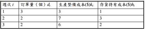 本週剩餘之存貨為一個,即第一週之初始存貨為 1 個,除每次之生產整備成本外, 每週生產 yi 個,i=1, 2, 3 之邊際生產成本為: