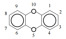 【已刪除】一、Dibenzo-p-dioxin(戴奧辛)的化學結構式如下圖,有兩個氯(Cl)原子取代的 dichloro-dibenzo-p-dioxin 異構物有 10 種,請寫出兩個 Cl 原子在戴奧辛分子苯環上 的數字。又 Cl 原子在苯環上那個位置的毒性較強?(10 分)