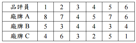 【已刪除】三、王研究員想研究 3 種廠牌咖啡的口味是否有顯著差異,找了 6 位品評員做測試,每 位都隨機次序品嚐這 3 種廠牌的咖啡,評分結果如下: