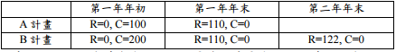 【已刪除】 ⑵請以內在報酬率,說明下表 A、B 兩計畫那個較好?(R 代表收入,C 代表成本; 有一個不容易算出,只要表現出那個計畫較好即可)?再分別用利率 i=10%與 20%,計算 A、B 兩計畫的淨現值,並說明那個計畫較好。(15 分)