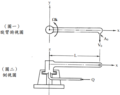 【已刪除】二、灑水噴頭裝置側視圖如圖二所示,圖一為其旋臂之俯視圖。xyz 座標為固定在地表 之座標。已知流量 Q 為定值,噴嘴面積 A