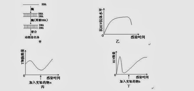 4.示意图甲、乙、丙、丁为某实验动物感染HIV后的情况( ) (A)从图甲可以看出,HIV感染过程中存在逆转录现象 (B)从图乙可以看出,HIV侵入后机体能产生体液免疫 (C)从图丙可以推测,HIV可能对实验药物a敏感 (D)从图丁可以看出,HIV对试验药物b敏感