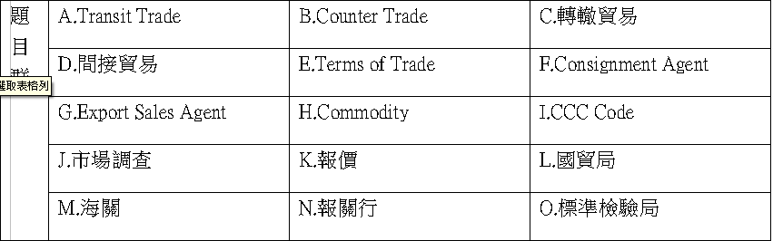 二、單選題 :共15題 每題2分 1.以下何者為貨物不須經過第三國海關通過之貿易? (A)轉口貿易 (B)三角貿易(C)居間貿