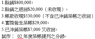 【已刪除】(三)、將將公司之呆帳政策係採帳款餘額百分比法,每年均採相同呆帳率。已知01年底應收帳款餘額$160,000,備抵呆帳貸餘$8,000。02年間發生以下交易: