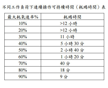 【已刪除】五、公式 R=W(B-S)/(B-0.3)為常用的休息時間計算公式,其中 R=休息時間,W=作業時 間,B=工作平均耗氧速率(公升/分鐘),S=耗氧速率標準。下表為不同工作負荷 下連續操作可持續時間(耗竭時間),工作負荷以最大耗氧速率之百分比呈現。現 有一作業,其操作員為女性,每日班次 8 小時,該作業之耗氧為 1.54 公升/分鐘, 已知國人女性之最大耗氧速率為 2.2 公升/分鐘,女性作業耗氧標準為 0.8 公升/分鐘, 根據公式與下表,請替該員規劃一合理可行的工作-休息排程表,並說明其原理。 (20 分)