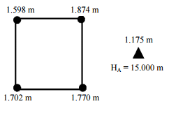 【已刪除】一、某塊邊長 10 公尺之正方形土地欲進行整地,以水準測量測得後視點位(A 點)及 正方形四個角點前視標尺讀數標註於下圖。已知後視點高程為 15.000 m,倘欲將該 地面整平至高程為 14.500 m,以長方體柱方式計算土方量(有效位數表達到立方公 尺以下一位),並須註明是挖方或填方。(20 分)