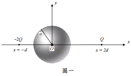 【已刪除】二、某一半徑為 a 之電中性金屬球置於座標原點,如圖一。今在 x = 2d 及 x = -d 處分別 放置帶電量為 Q 及-2Q 之電荷。試求金屬球面之電位。(20 分)