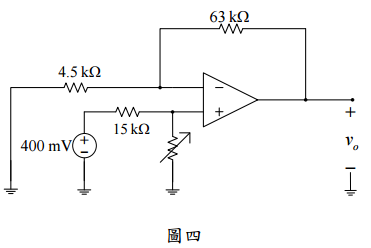 【已刪除】四、考慮如圖四所示含理想運算放大器之電路,試求可變電阻設定在 60 kΩ 時的輸出電 壓。(15 分)