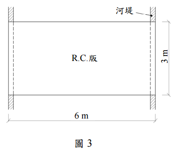 【已刪除】三、一鋼筋混凝土矩形版,兩端各置於河堤上,作為跨河之臨時便橋使用(請參閱圖 3)。 若版厚為 25 cm,活載重為 500 kgf/m