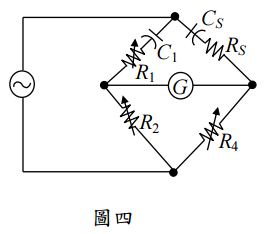 【已刪除】四、如圖四所示電路其中 G 代表微流計,利用交流電橋電路及標準電容來測串聯式 未知電容,其中工作頻率為 1 kHz、標準電容 C1 = 0.1μF ,當電橋平衡時, R